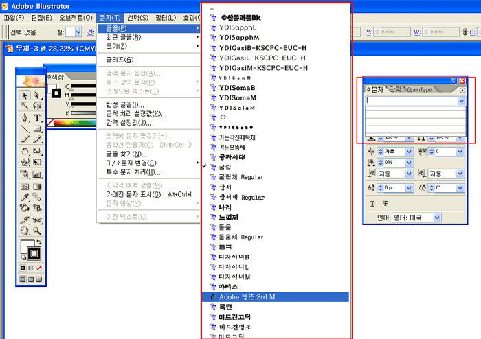 일러스트 cs2 깔고 나서 글꼴이 안보여요