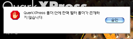 해당 내용때문에 다운이 되지 않습니다. 해당 내용이 안뜨게 하시려면 쿽3.3 폴더안에 익스텐션안에 한맥필터와 Eficolor....휴지통에 버리시면 됩니다. 없어도 상관 없는겁니다. 쿽이 자주 따운되는 아래 내용을 참고하세요. 1.666바이러스 문제 666바이러스 체크는 agax 1.3으로 하시면 되는데 대도록 시디나 외장으로 부팅을 해서 해주시는것이 완벽하게 치료하는 방법입니다. http://www.tomatomac.com/?doc=bbs/gnuboard.php&bo_table=mac_souce_program&sselect=wr_subject%7Cwr_content&stext=agax&soperator=0&page=1&wr_id=94 사용방법은 아래 링크 http://kmug.co.kr/board/zboard.php?id=system&no=386&ln=&ls=on&lc=on&lcc=&keyword=agax 2.쿽프로그램에 사용메모리를 너무 작게 셋팅을 하고 작업을 할때 쿽에 사용메모리는 최소 100MB정도는 해주셔야 됩니다. 그래서 내장메모리가 최소 768MB~1GB이상은 되어야 됩니다. 3.자형폴더에 서체가 너무 많은경우 압니다. ================== 베스트맥(아이디)를 클릭하고 [자기소개]를 참고하세요.