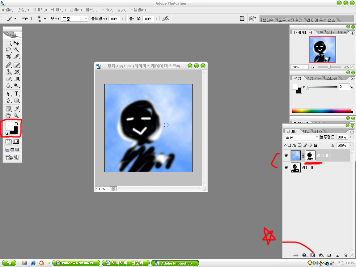 그리고 마스크부분을 브러쉬툴로 슥슥 지우거나 만들거나 하시면 됩니다..