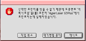 안녕하세요? 박노훈입니다. 일단 작업을 취소해주세요. 그런데, 지금 프린터는 정상적으로 동작을 하는지요? 프린터 전면의 LCD를 보시어 Idle이나 Ready라는 단어가 나와 있으면 됩니다. 애플 메뉴 > 선택자에서 Adobe PS나 LaserWriter 8을 선택하고 우측 윈도우에서 HyperLaser G3를 클릭 하단부에 있는 설정(혹은 Setup)을 클릭한 후에 수동(혹은 PPD 선택)을 클릭하고, 창이 하나 열리면 HyperLaser PPD 파일을 선택하고 열기를 하세요. 그런 후에 해당 프로그램의 페이지 설정과 프린트에서 프린트 기종명과 사이즈를 확인하신 후에 출력을 해보시기 바랍니다. 지금 메시지로 보아서는 설정의 문제라기 보다는 어쩌면 하이퍼 레이저 프린터의 기기적인 연결상에 문제가 있지 않을까 하는 생각이 듭니다. 차근차근 단계를 확인하시어 문제의 원인점을 찾아 잘 해결이 되기를 바랍니다. 감사합니다.