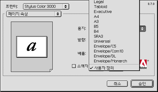 Stylus Color 3000로 설정하니까 A2도 뜨네요 그런데 전에 adobePS 8.5.1에서PPD설정을 하이퍼레이져G3로 해도 A2가 떴는데 8.7은 그때그때마다 PPD설정을 바꿔야 하나봐요 암튼 많은 관심 감사합니다...