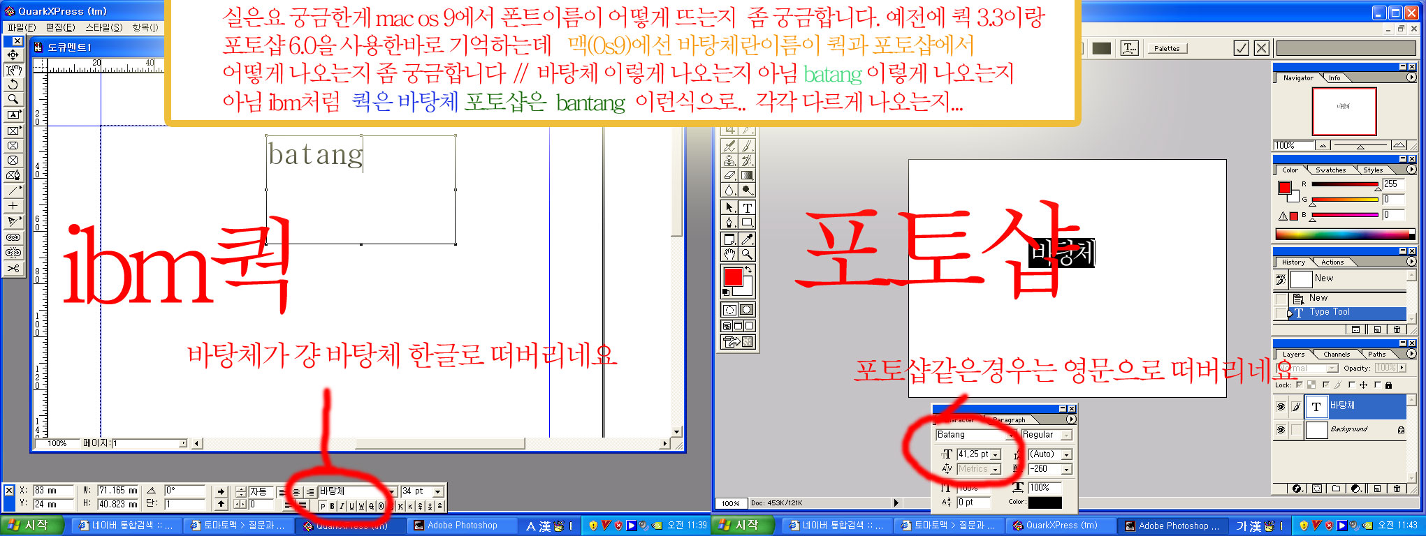기억이 가문가문한데 쿽3.3이랑 포토샵이 서로 각각 폰트목록뜰때 바탕체란이