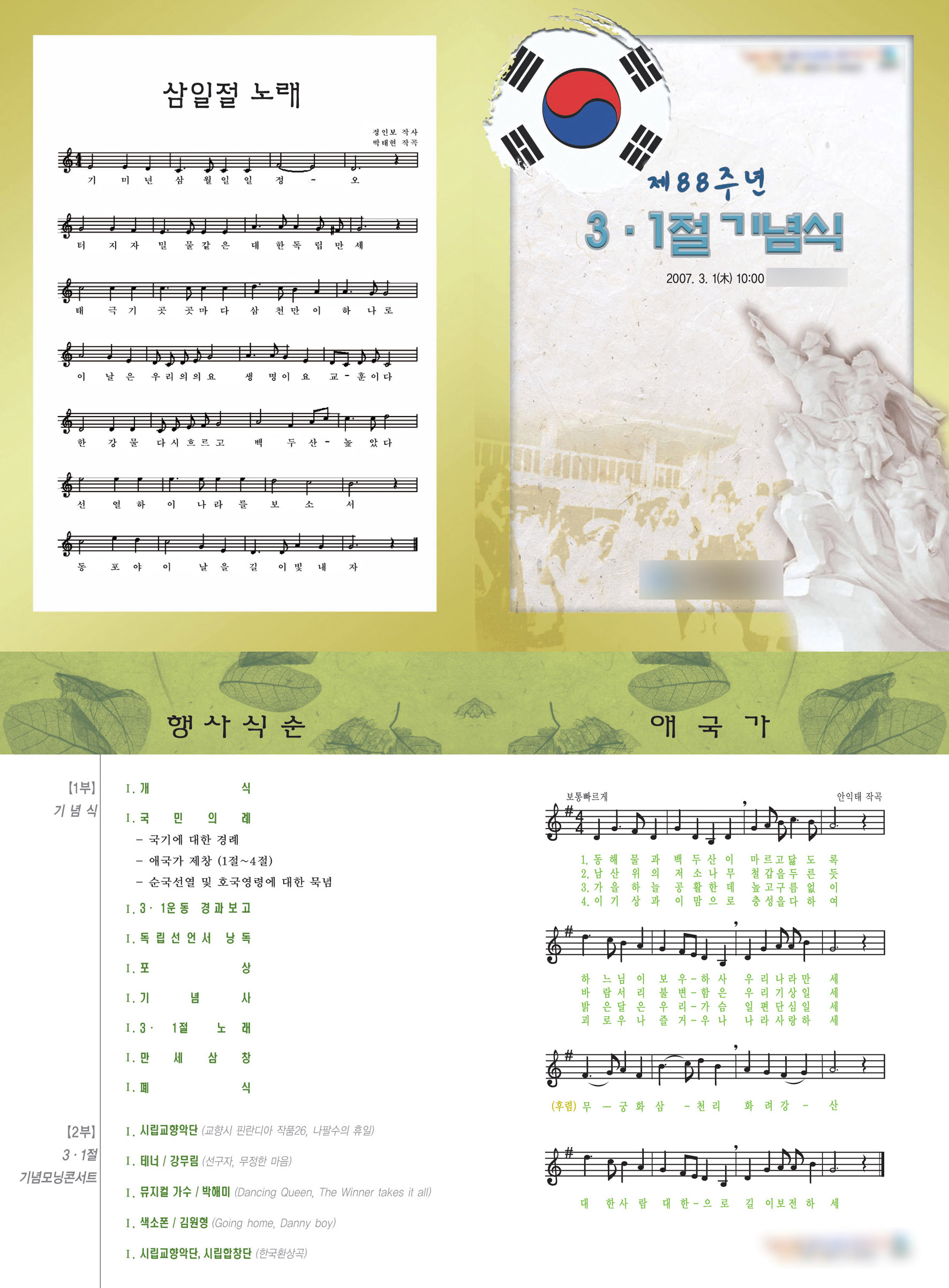 그냥 개인적으로 한번에 본 느낌인데요..바탕의 빽으로 깔린 무늬"나뭇잎"맞죠..그게 삼일절하고 약간 동떨어져 보인다고 해야하나...삼일절은 약간 역동적이거나 뭉클한 느낌인데..나뭇잎은 좀 서정적이고..차분한 느낌이 더 많이 나는거 같아서요^^....이미지를 쓸때..좀더 컨셉과 맞아떨어지면 더욱 괜찬아지지 않을까..싶은데요^^...삼일절!..층성!