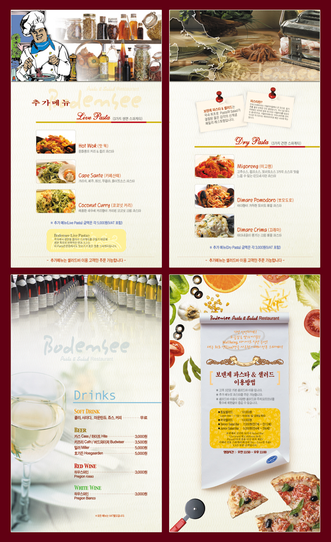 보덴제 파스타&샐러드 레스토랑의 메뉴판 내지 작업한 시안입니다.