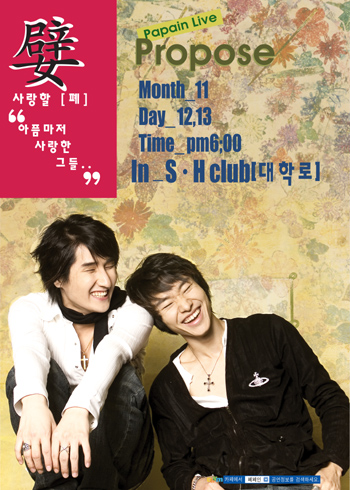 그리고 일시 장소는 물론 기존 작품처럼 영문에 각각 세로로 배열하는 것은 차별성도 있고 나름대로 재미도 있지만, 지나가는 이들의 눈에는 바로 들어오진 않는 듯 함미다,, 그냥 '11.12~13 장소어디 ' 정도로 간략하게 하는 것이 더 빨리 알게 될 수 있지 않을까요,, 타이틀인 papain live propose 역시 먹바탕에 어울리는 색과 크기로 잘 배열하면 눈에 더 잘 띌 것 같슴미다,,^^