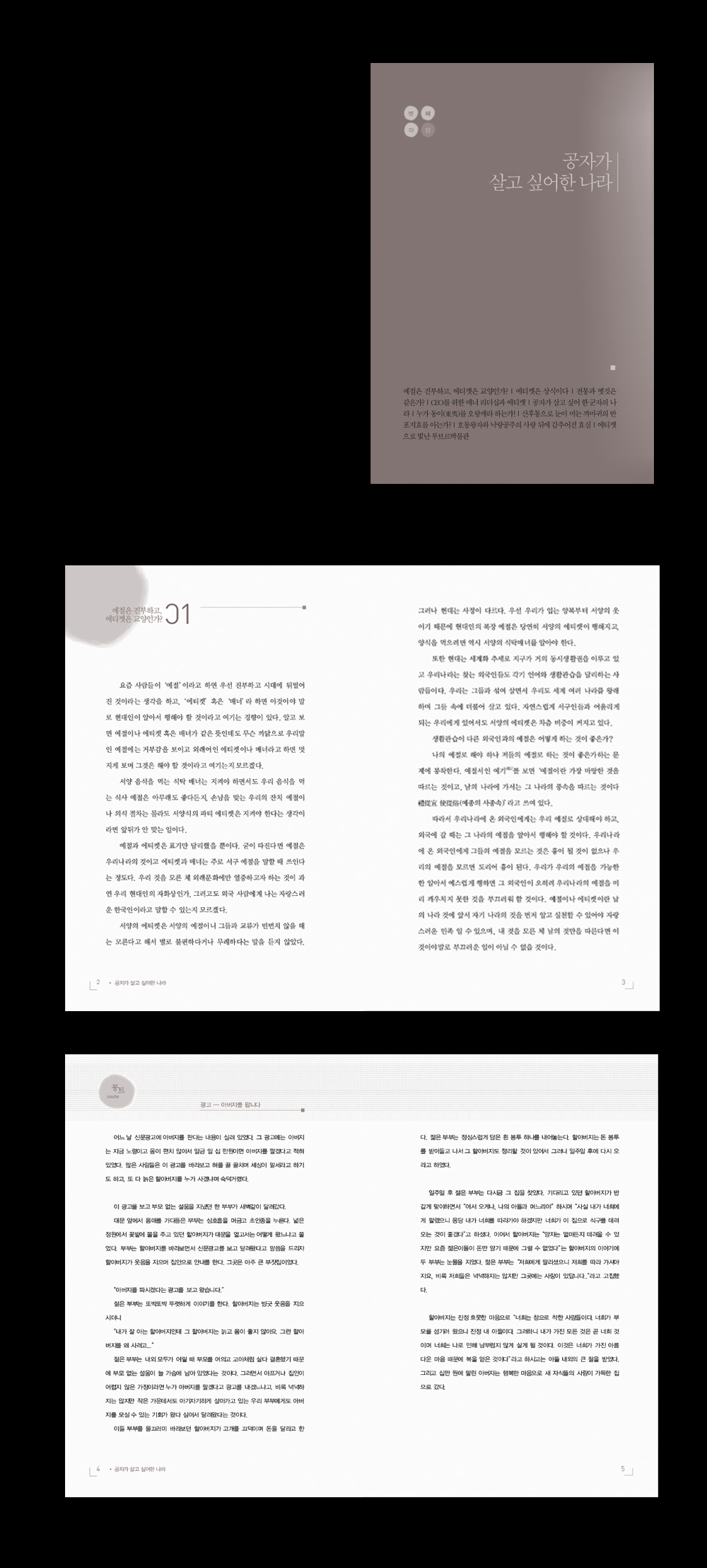 01에 좌측과 우측페이지에 행간위치(격자)가 틀어진거만 빼면 무난하고 깔끔한 편집이겠네요. 안정된 느낌은 있으나 딱 맞아떨어지는 느낌은 부족한듯 싶기도 하고