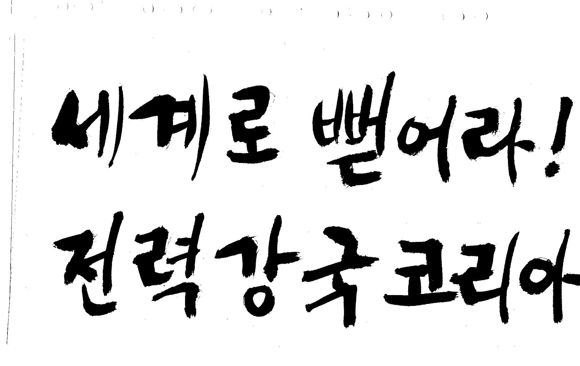 캘리 좀 부탁드려요!~ 김철호 일반 1 10798 2008.12.24 12:09 > > > > > 전력회사 신문광고를 하는데요 캘리로 멋지게 하고픈데 > > 캘리프로그램으로 아무리 써도 느낌이 안나옵니다 ㅜ.ㅜ > > 이런걸 부탁한다는 자체가 너무나도 염치없지만 부탁드립니다. > > > > 세계로 뻗어라! 전력강국 코리아 > > > 보기는 쉬워도 하기는 어려운게 > 세상 모든 일 일겁니다. > 그중에 캘리그라피가 그런것 일 겁니다... > 스캔중에 글꼴이 잘린것은 서로다른글꼴서 편집하시길... > 글수가 많아서 어쩔 수없네요... >