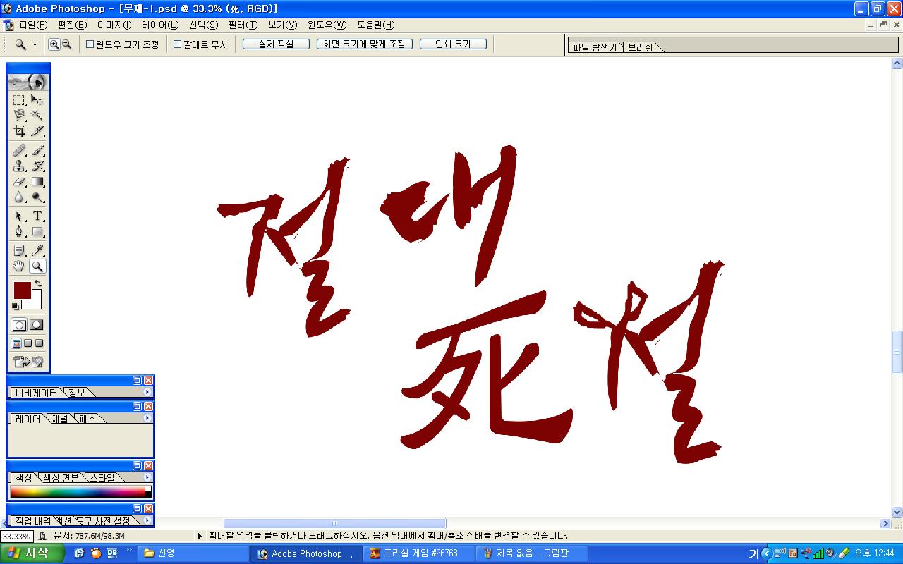정중히 캘리 부탁드립니다. -_- 류재철 일반 0 6015 2009.11.16 11:18 실력자 분들이 많이 계셔서 이렇게 염치없게 부탁드립니다. - 절대死절 : 첨부한 파일 참고해주시면 감사하겠습니다.(약간 거친느낌? ^^;;) : '절'자의 ㅈ은 가위로...^^;; : 포스터 제작용이라 ai 파일이 필요합니다. 대학동아리 연극공연 포스터로 쓸 예정입니다. 비상업적인 공연이라 이렇게 부탁드립니다.