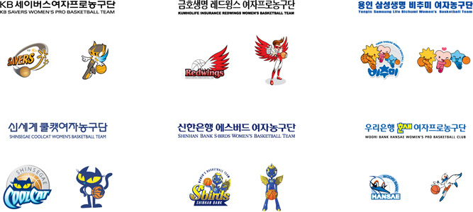 WKBL 각 구단 로고, 엠블럼, 마스코트 glass 일반 3 10537 2008.03.14 19:42 -0001.11.30 00:00 WKBL.sit (0byte) + 177 [여자프로농구단] KB 세이버스, 금호생명 레드윙스, 용인 삼성생명 비추미, 신세계 쿨캣, 신한은행 에스버드, 우리은행 한새
